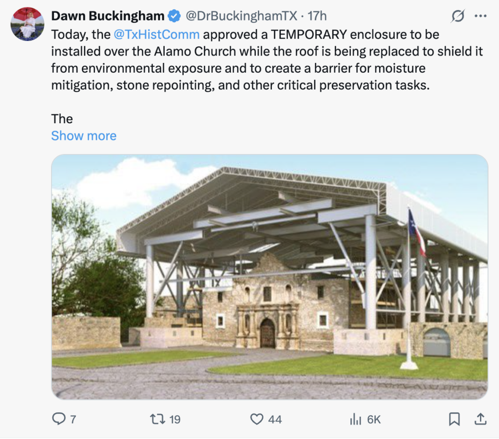The THC’s decision to approve the temporary enclosure comes as part of the broader effort to protect the Alamo, a site of profound historical significance. Buckingham further emphasized the Alamo’s role in American history, stating, “As Texas Land Commissioner, it’s my honor and duty to ensure the @OfficialAlamo forever stands as a beacon of liberty for all who visit.”