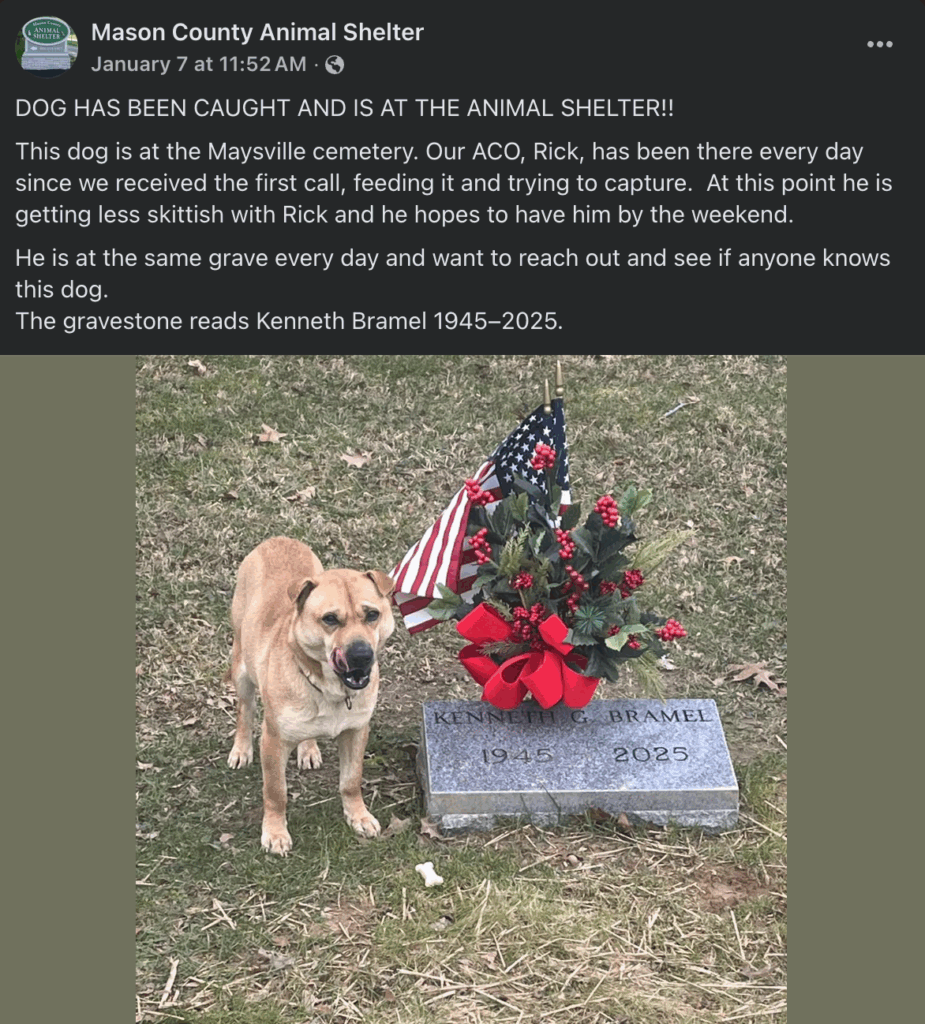 According to the Mason County Animal Shelter, the dog has been observed returning daily to one specific grave at the Maysville Cemetery. The headstone bears the name Kenneth Bramel, with dates listed as 1945–2025. Since receiving the initial call, animal control officers have confirmed the dog’s consistent presence at the site.